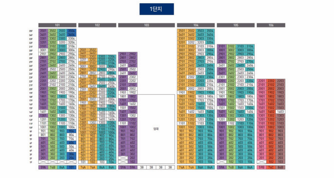 단지규모는 1단지 지하 2층에서 지상 35층 6개동