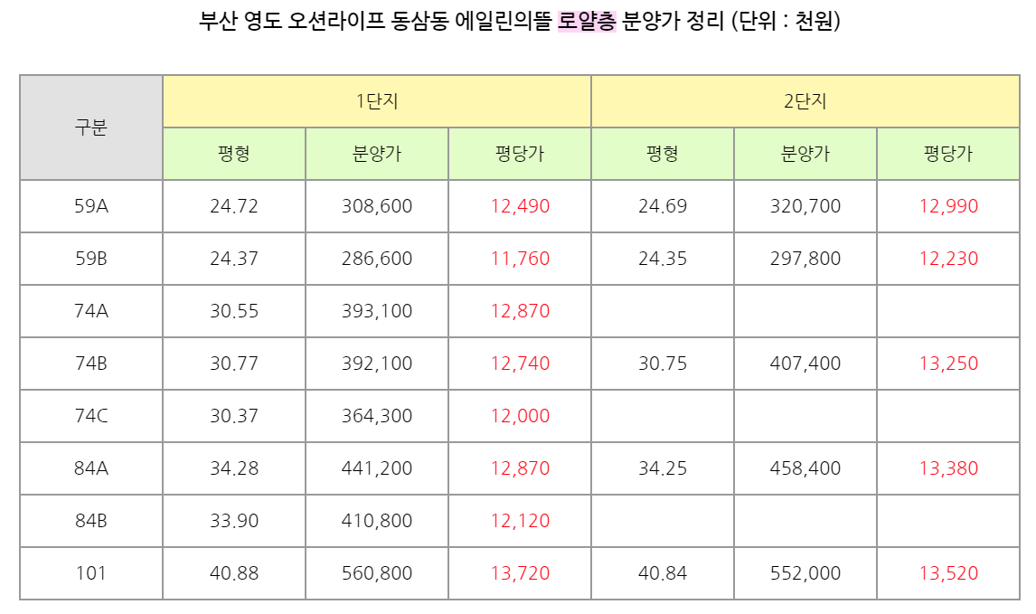 부산 영도 동삼 오션라이프 에일린의들 로얄층 분양가 정리!