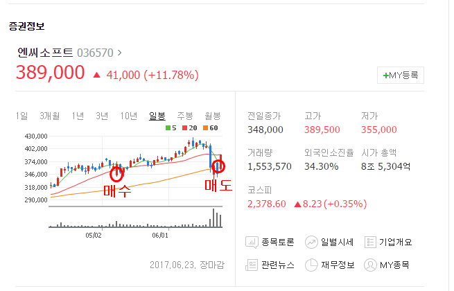 약 17년 5월 초 관심있게 지켜보다가 한번 출렁했던 시점이었던 354,000원즈음에 매수를 할 수 있었고